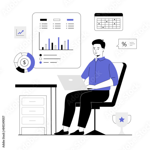 Digital business concept. Man work with charts and graphs. Management, planning, strategy development online. Vector illustration with line people for web design.