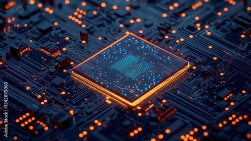 Digital Circuit Board with Glowing Microchip and Neon Lights