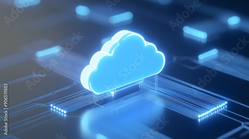 Digital cloud computing concept with blue futuristic circuit background, symbolizing data storage, technology, and network solutions.