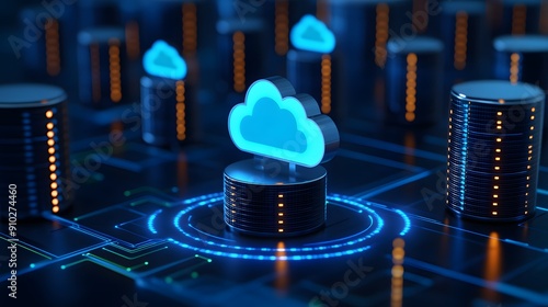 Digital cloud computing concept with data servers. Futuristic technology for data storage, processing in a modern, secure network.