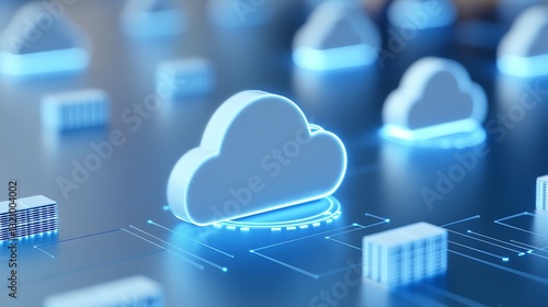 Digital Cloud Computing Concept with Glowing Clouds and Data Blocks on a Futuristic Surface