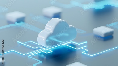 Digital cloud computing concept with interconnected nodes, representing data storage, networking, and technology applications. 3D Illustration.