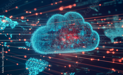 Digital cloud computing icon with data points and connections in a high-tech futuristic interface.