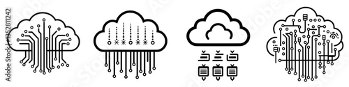 Digital cloud computing symbols representing data transfer, storage, and connectivity in modern technology infrastructure