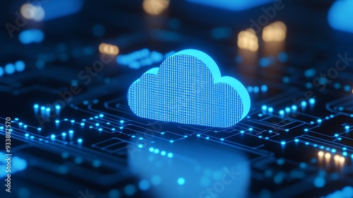 Digital cloud icon on a futuristic circuit board, representing cloud computing and modern technology in a digital environment.