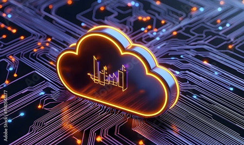 Digital Cloud Icon on Circuit Board with Graphs and Data Lines