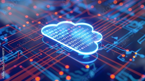 Digital cloud icon with binary code on a glowing circuit board, representing cloud computing and data storage technology.