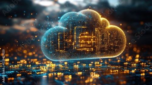 Digital cloud representing data storage with glowing elements and abstract cityscape background