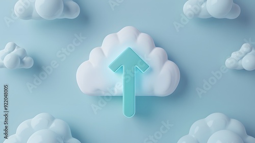 Digital cloud with an upload arrow, representing cloud storage and data upload in a soft blue background with clouds.