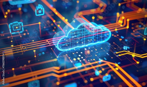 Digital cloud with circuitry and icons representing technology and data.