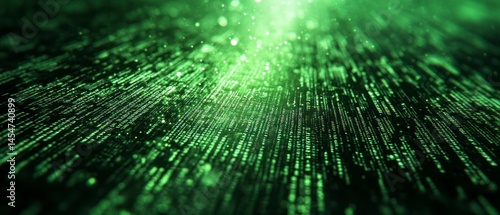 Digital code cascades down, illuminating a space with bright, glowing green data.