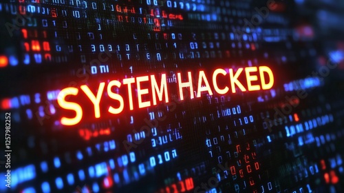 Digital code with 'system hacked' text symbolizes data breaches and cybersecurity threats.