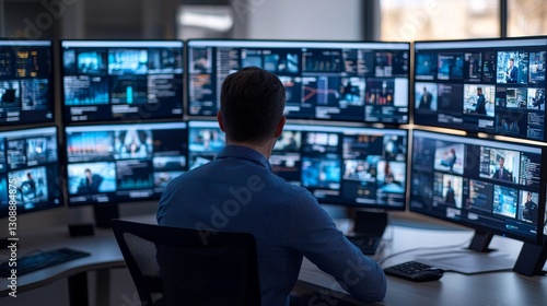 Digital Collaboration coordination concept. A person monitors multiple screens in a high-tech control room setting.
