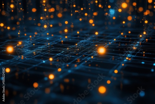 Digital cryptocurrencies on a blockchain network visualize interconnected transactions with glowing data points and grids displaying the complexities of blockchain technology