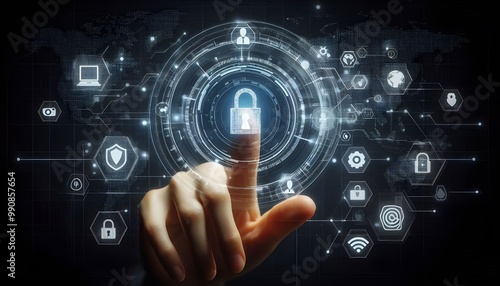 Digital cybersecurity interface with hand pointing at lock icon on dark background.