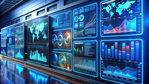 Digital dashboard displays metrics and analytics on a futuristic interface, showcasing efficient data streams and organized workflows for optimal system management and control.