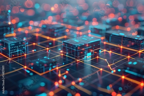 Digital data flow in secure system analytics strategy illustrated with 3D network structures guiding information accumulation. Concept Digital Data Flow, Secure System Analytics