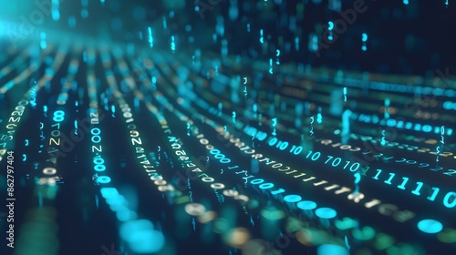 Digital data flow with binary code representing tech, coding, and info transfer