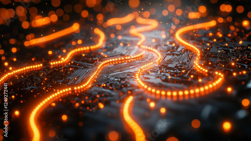 Digital data flow with bright blue and orange lights creating an abstract network in a virtual environment