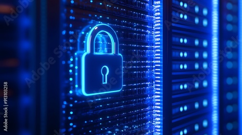 Digital data security concept with blue neon padlock and server racks in a data center, emphasizing online protection and encryption.