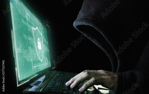 Digital data security system and protection. Anonymous hacker try to hacking on computer laptop