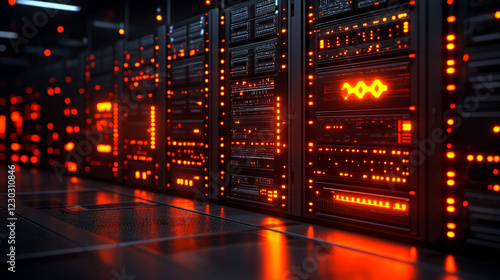 Digital data storage concept with glowing server and binary code minimalistic design bright tone modern technology with blurred background and empty caption space