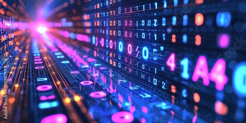 Digital data stream, glowing binary code, futuristic tunnel, technology background, website header