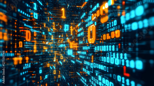 Digital data stream tunnel, binary code, technology background, cybersecurity concept