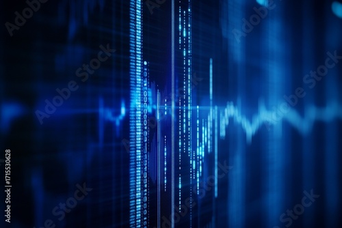 Digital data stream visualization with blue waveform and binary code patterns on a dark background