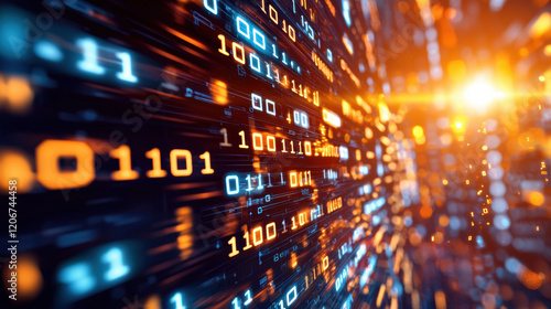 Digital data stream with binary code and glowing lights creating vibrant effect