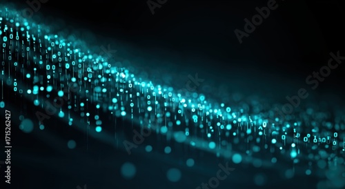 digital data stream with binary code waves and particles on a dark blue background, with a glowing turquoise effect Generative AI