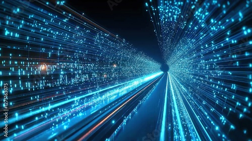 Digital data stream with glowing lines on a blue background, representing a cyber speedway or train moving fast through a dark tunnel of binary code, symbolizing information technology.
