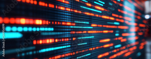 Digital data streams with vibrant blue and orange lines create futuristic atmosphere