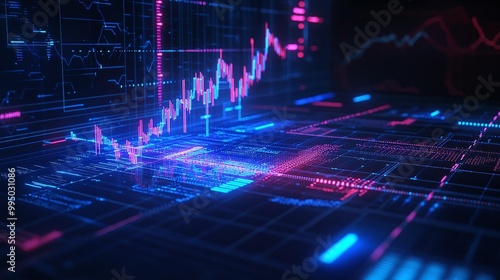 Digital data visualizations featuring abstract graphs and charts in vibrant colors on a futuristic background.