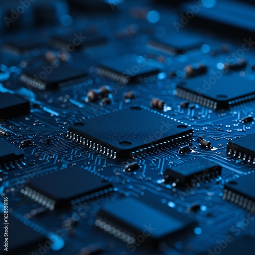 Digital Electronics: Blue Circuit Board with Microchips.