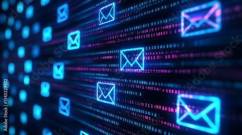 Digital Email Communication Concept with Binary Code and Neon Icons for Modern Technology Background