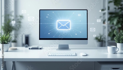 Digital Email Icon on Desktop Screen in a Modern Office