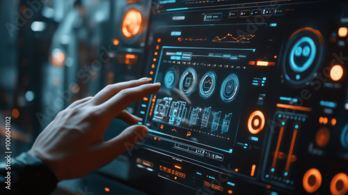 digital energy dashboard displaying power consumption metrics, showcasing interactive interface with various graphs and data visualizations. user engages with technology, highlighting importance of