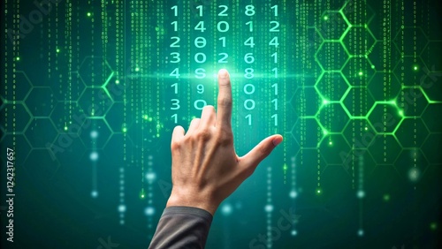 Digital Finger Touching Glowing Binary Code with Green Hexagonal Patterns Background