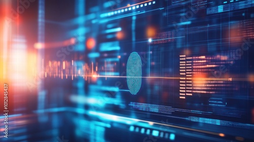 Digital fingerprint technology with a futuristic interface and data visualization.