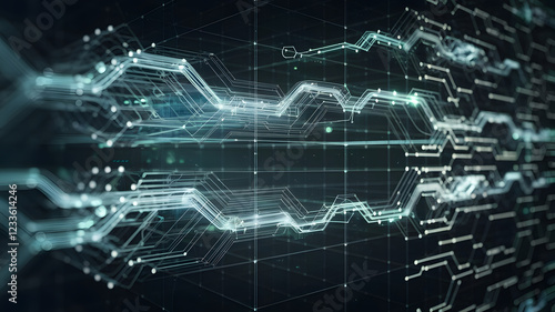 Digital Flow: An abstract visualization of data streams flowing through a network of interconnected lines and nodes, representing the concept of digital connectivity and information transfer.