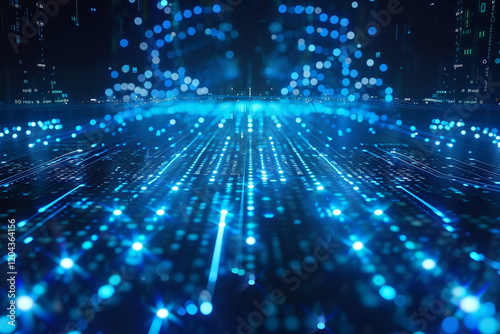 Digital Future: Blue Binary Data Flowing on a Computer Screen Background