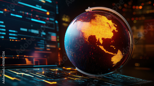 Digital globe showcasing Asia with glowing data patterns and technology