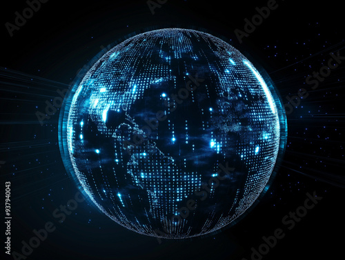 Digital Globe with Binary Code and Data Flow, Blue Grid and Golden Lights