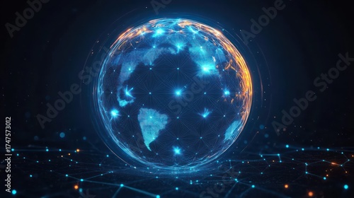 Digital globe with glowing blue and orange network connections representing global communication and technology network