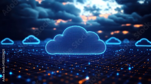 Digital glowing blue cloud icons floating above a grid surface with a dramatic cloudy sky background, symbolizing futuristic cloud computing technology