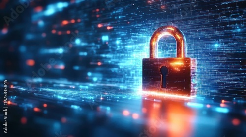 Digital glowing padlock surrounded by streams of binary code and data lines representing cybersecurity and data protection