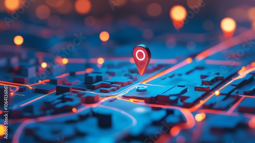 Digital GPS, neon map pin location. Innovation navigation technology concept, network connection, information pointers