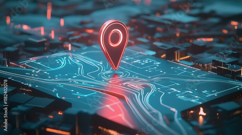 Digital GPS, neon map pin location. Innovation navigation technology concept, network connection, information pointers