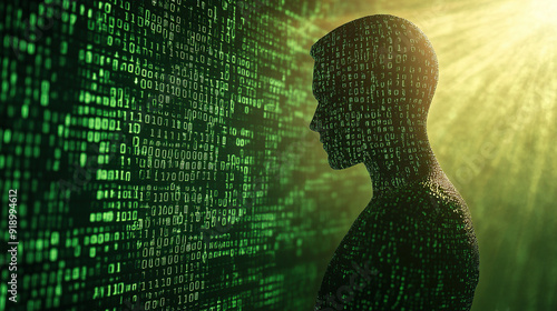 Digital human silhouette with binary code on data background